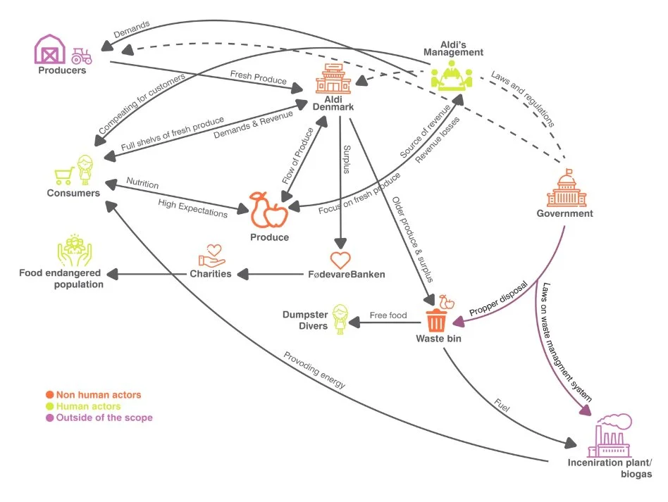 The project began with an effort to develop a broader understanding of produce turned into food waste through desk research as well as initial interviewees with the main stakeholders. Following this, we were able to map out the important relations that influence the food system in Denmark