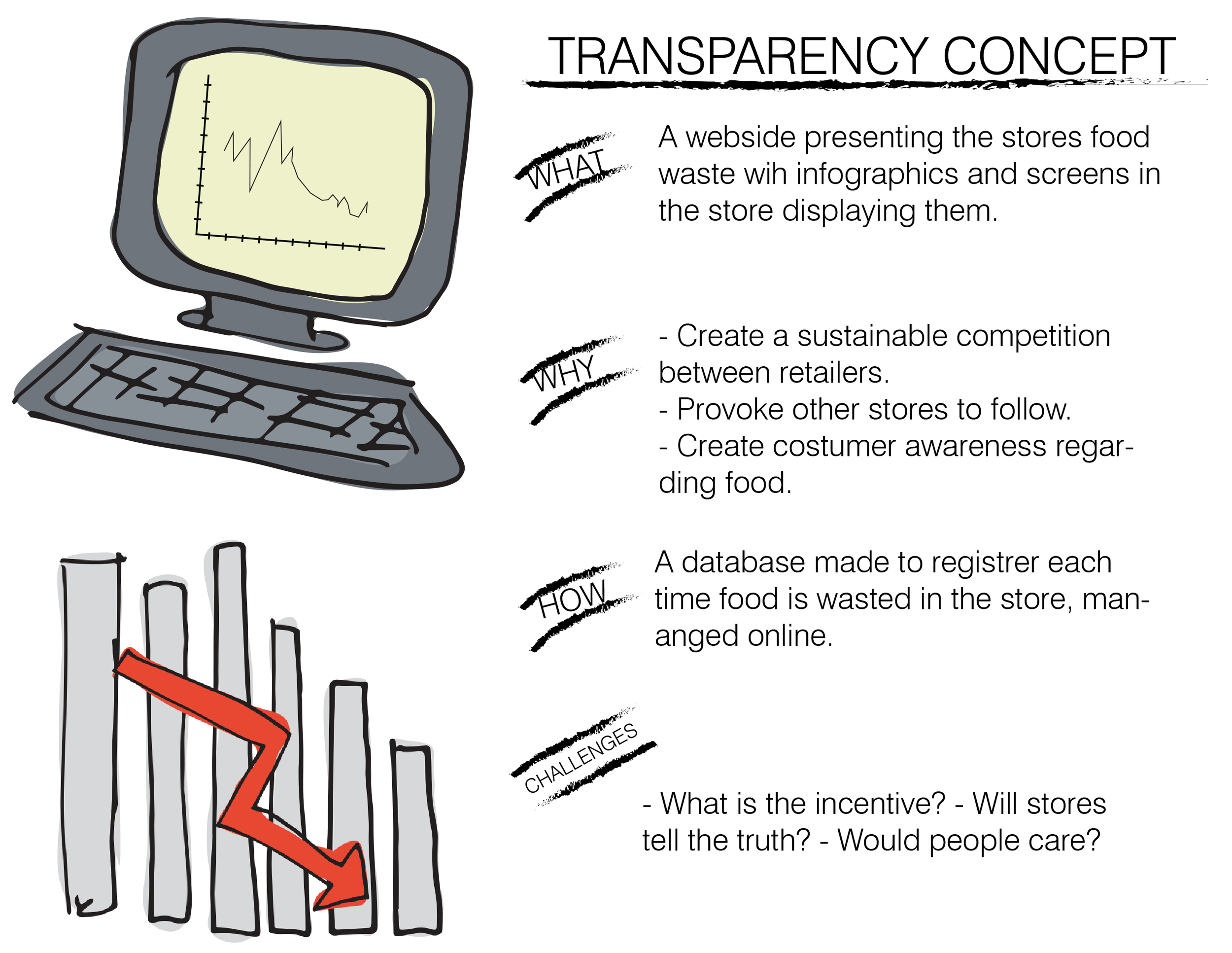 A timer of 2-3 minutes was set for each brainstorm of the chosen problem areas. It was agreed that each of us should try to create both an experimental concept and a more feasible concept for each brainstorming process. When the time ran out, each participant was to elaborate their concepts while putting them up on the whiteboard. Each of us got 2 votes for each problem area solution and the concepts with the most votes were selected to be iterated in a new development process. This led us to create 4 different concepts which had the potential to be implemented at the ALDI store.